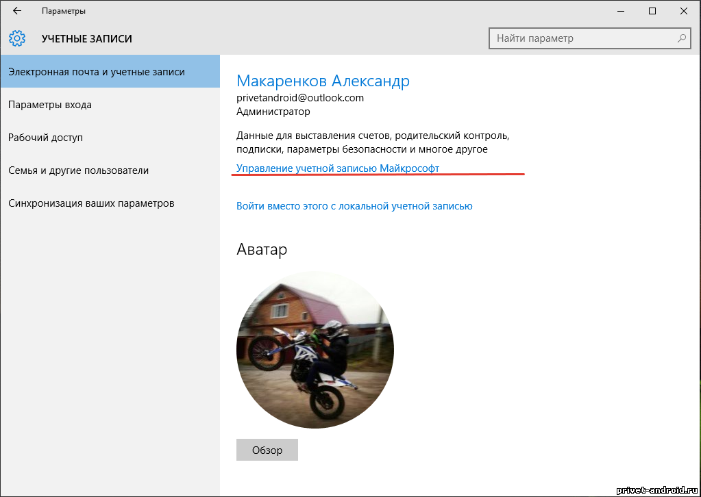 Доброго времени суток. Сегодня расскажем вам как переименовать учетную запись на устройстве с управлением Windows 10. В 10 версии программного обеспечения используется две учетные записи. Одна из них называется локальная и вторая учетная запись Microsoft. Чтобы переименовать одну их них, используется разный порядок действий на вашем компьютере. Давайте начнем с учетной записи Microsoft. Для того, чтобы ее переименовать вам необходимо перейти на официальный сайт, а точнее на саму страницу, которая позволяет изменить или редактировать учетную запись. "Учетная запись Microsoft". Так же это можно сделать из панели "Параметры → Учетные записи → Электронная почта и учетные записи", кликнув по ссылке управление учётной записью Microsoft.
