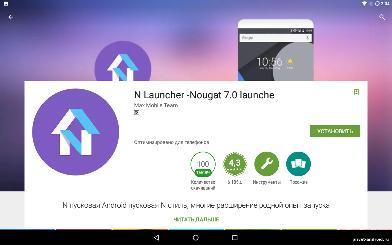 N Launcher -Nougat 7.0- Это мобильное приложение, которое сможет изменить вид вашей оболочки, Скачать его может любой желающий пользователь на Google Play. В этом лаунчере, разработчики очень постарались, добавили множество различной анимации, плавных переходов и добавили поддержку более чем 500 тем, которые вы можете сами добавлять на свой рабочий стол.